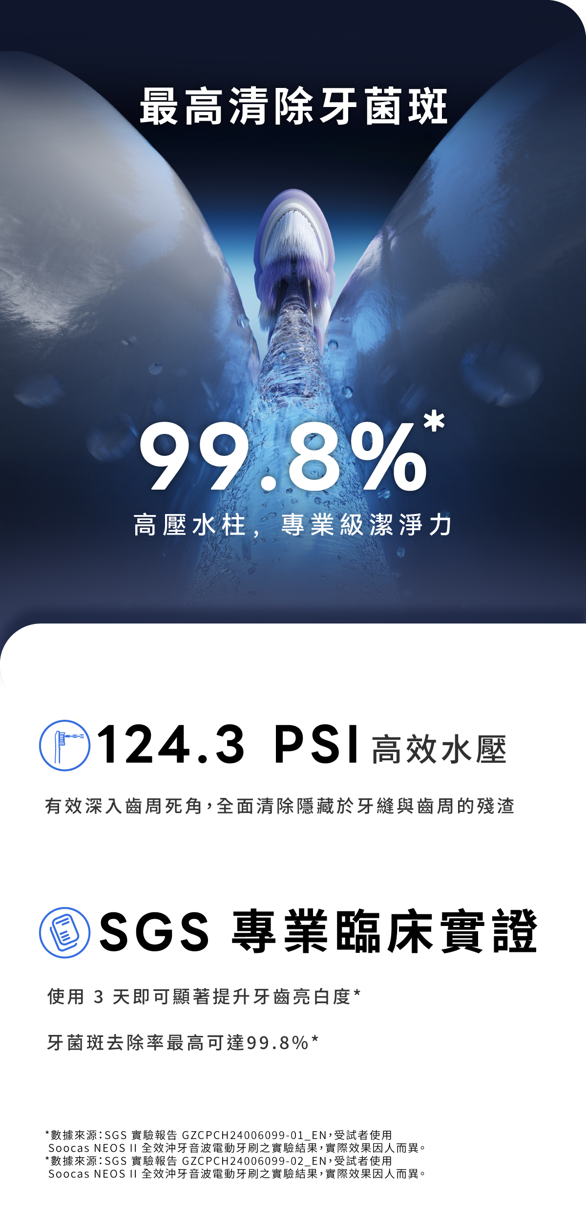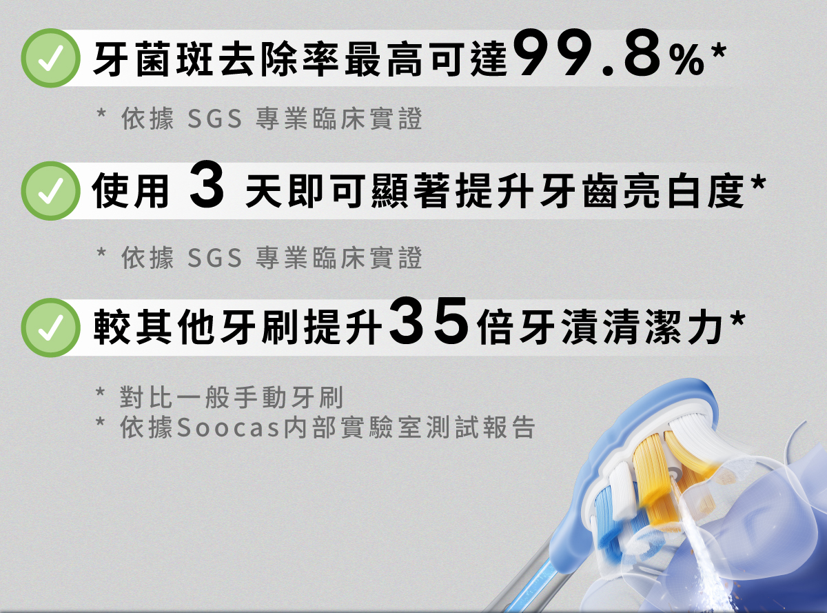 • SGS 專業臨床實證:牙菌斑去除率最高可達 99.8%*