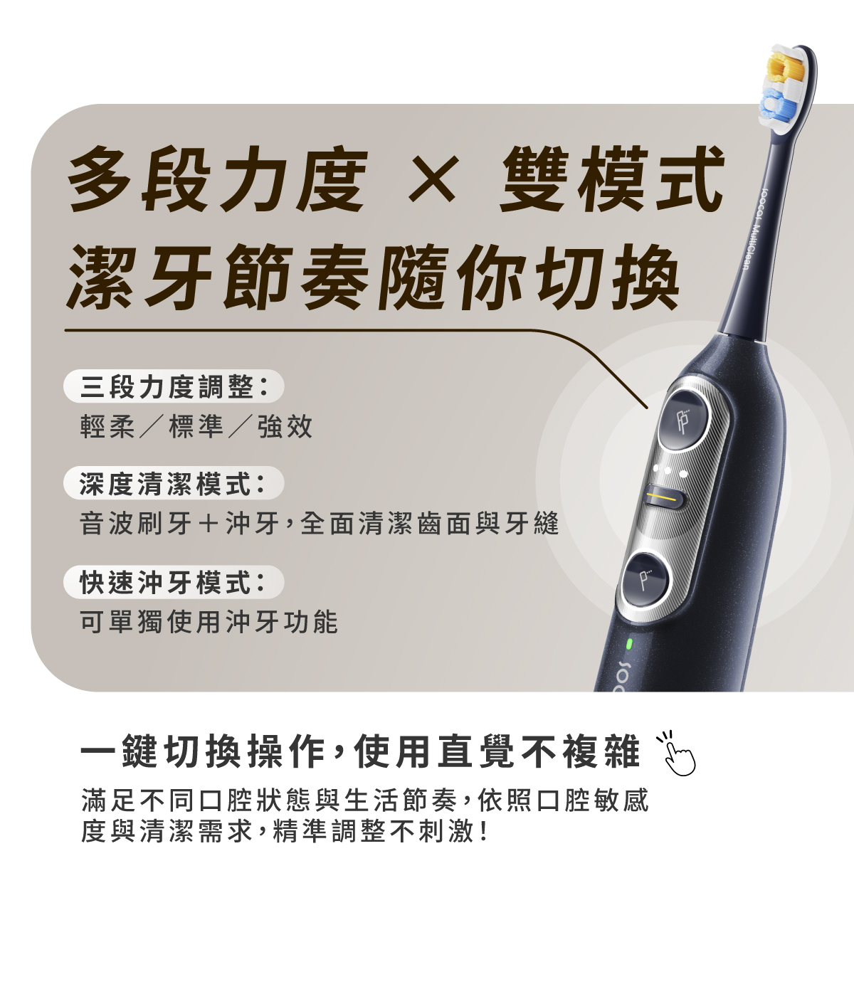 • 音波震動+穩定水柱:深入齒縫與齒周死角,提升牙菌斑清潔效率