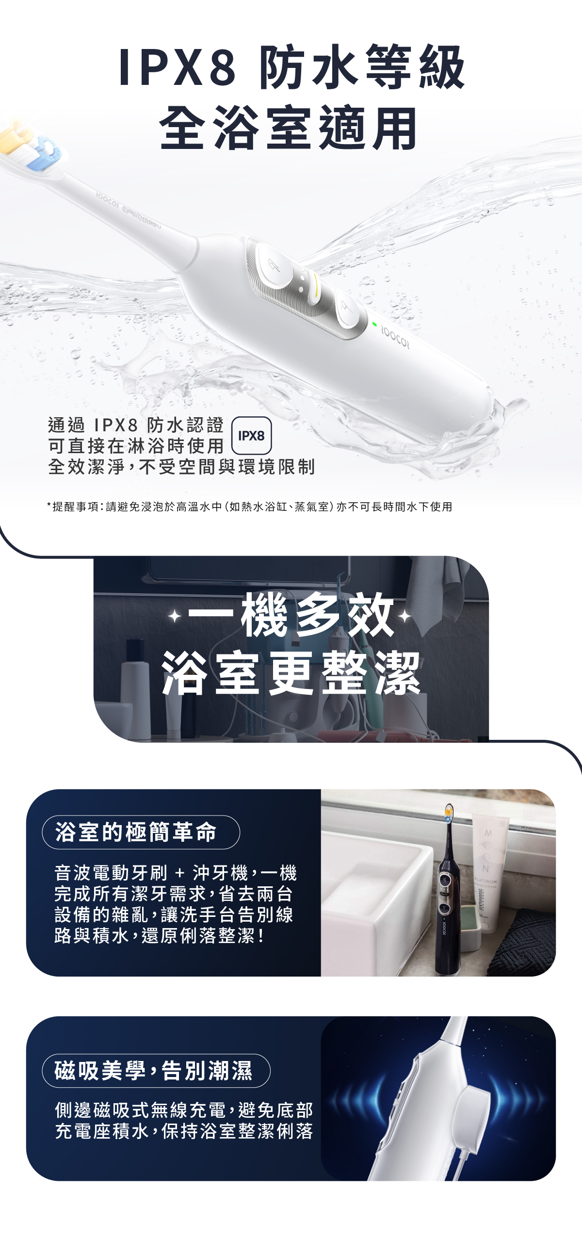 • IPX8 防水等級:全浴室環境安心使用