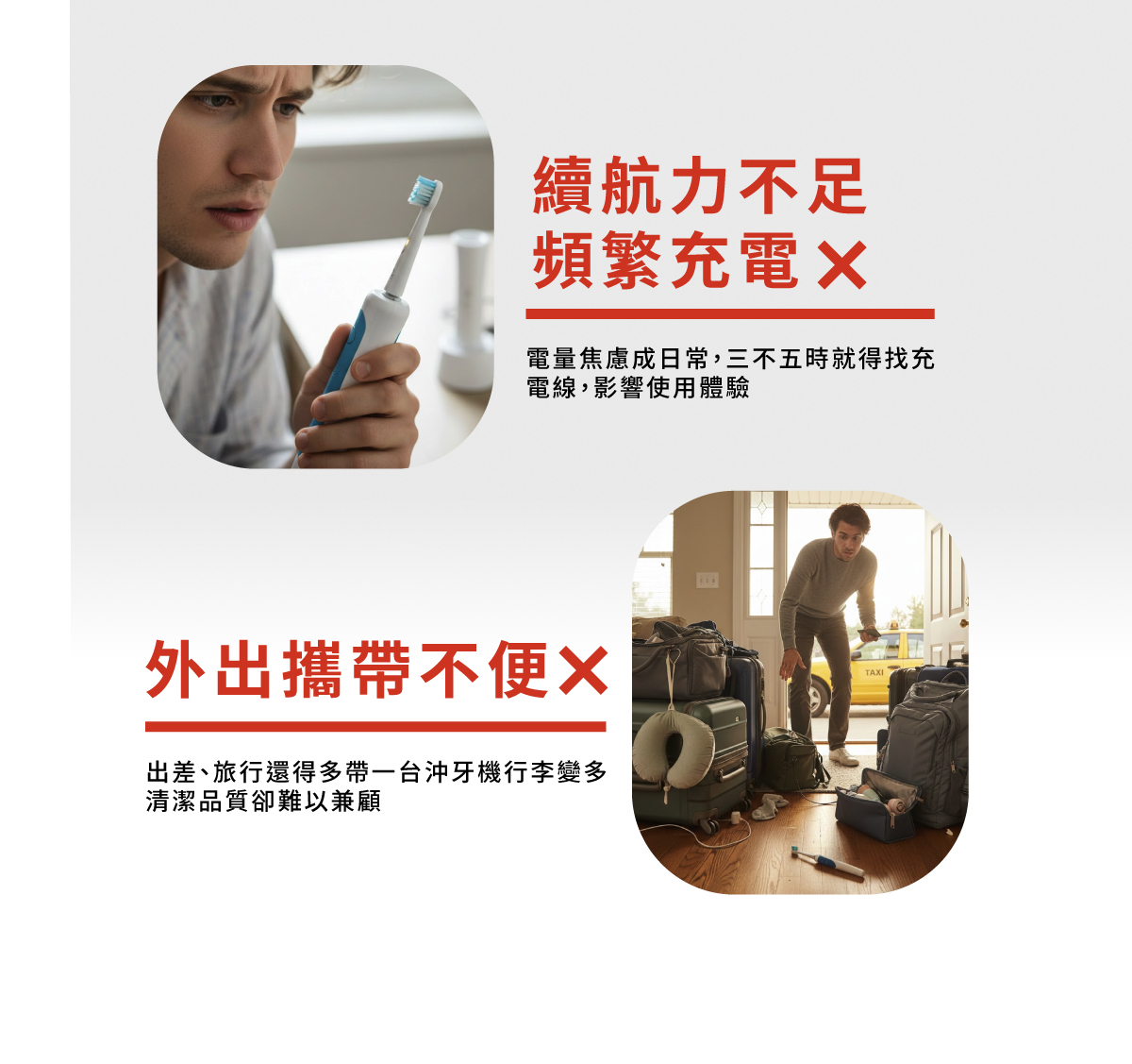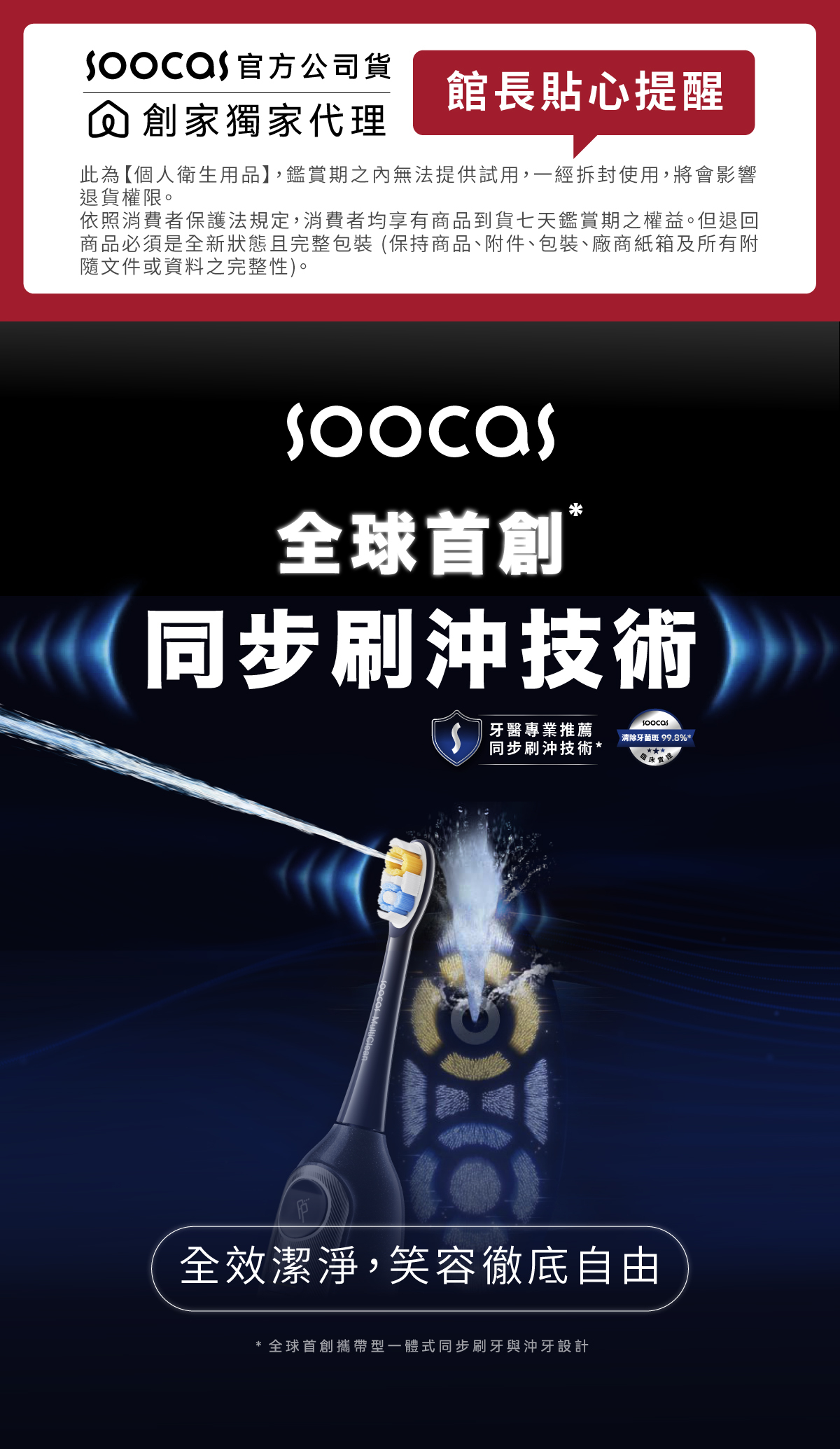 • 日常全效款同步刷沖技術:沖牙、音波震動同步清潔